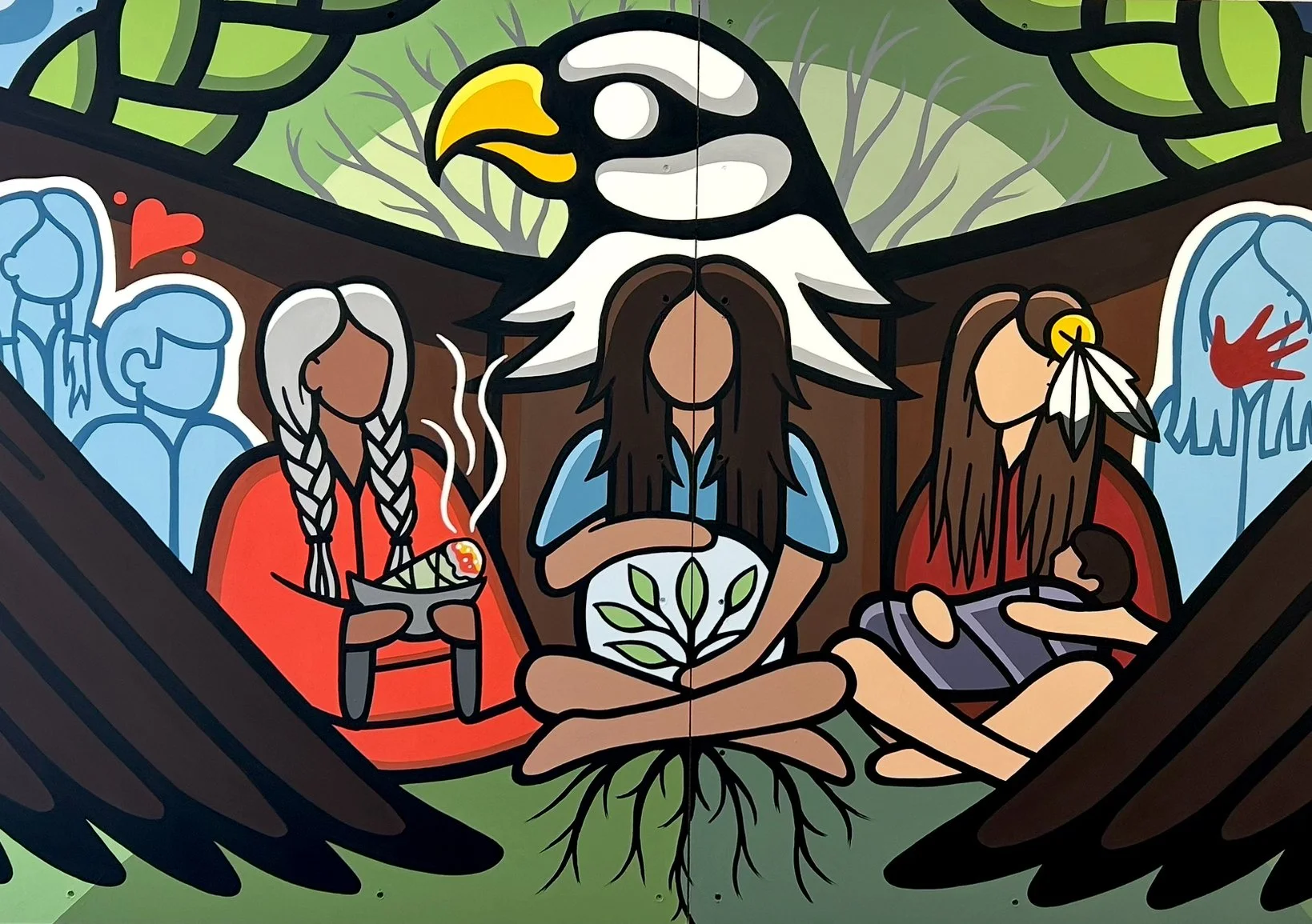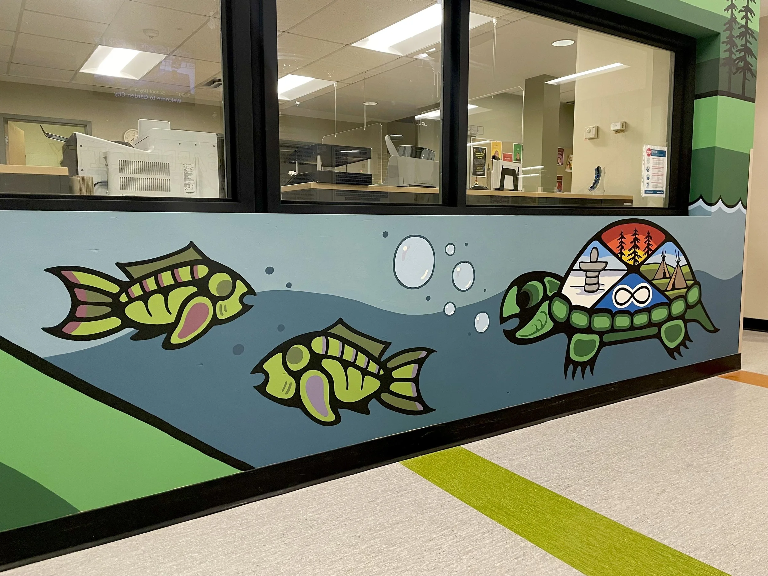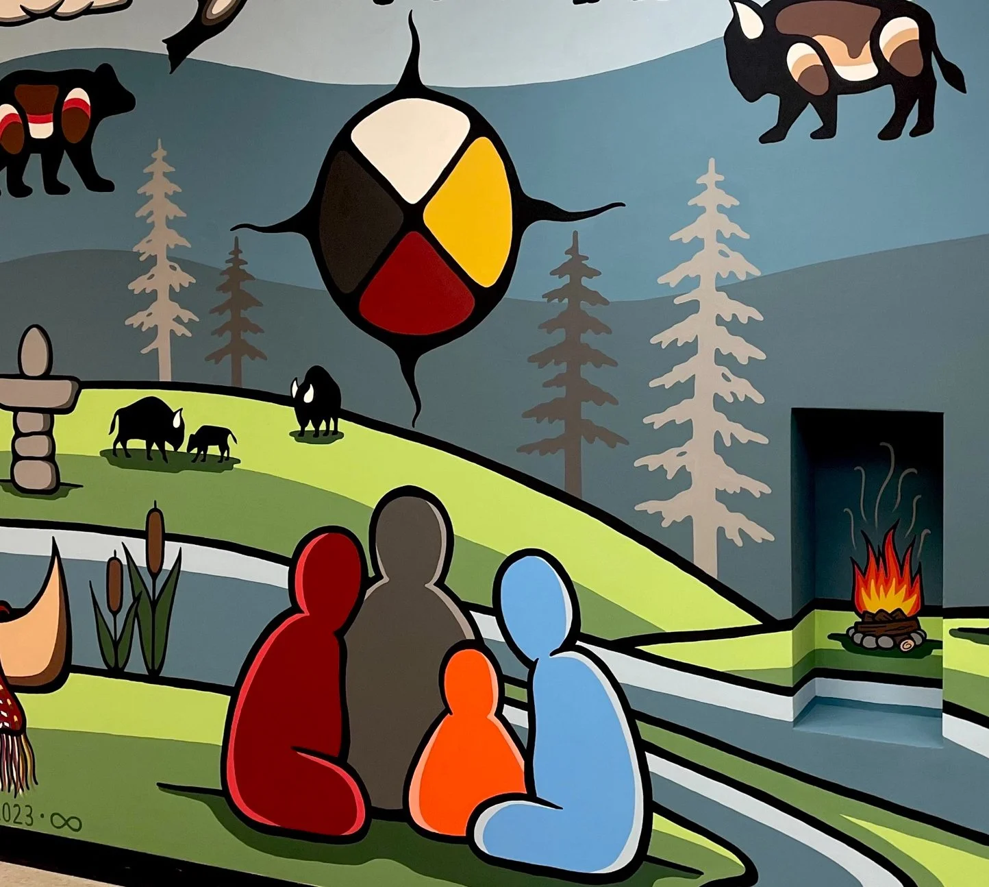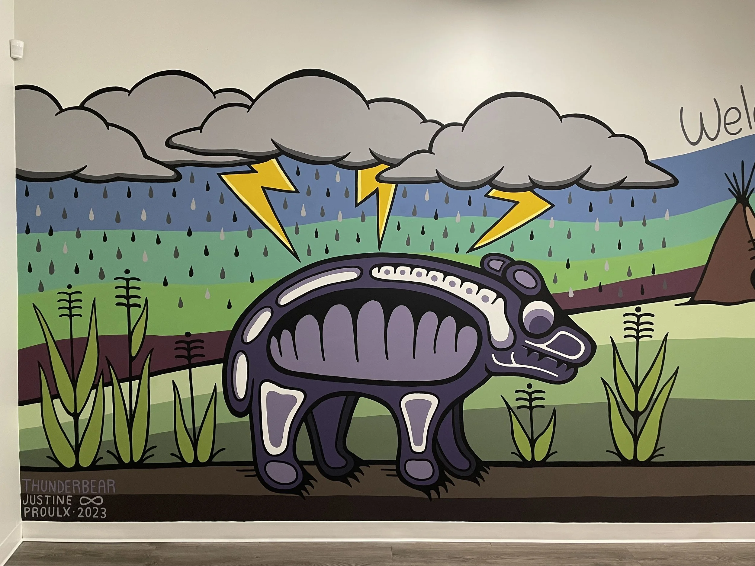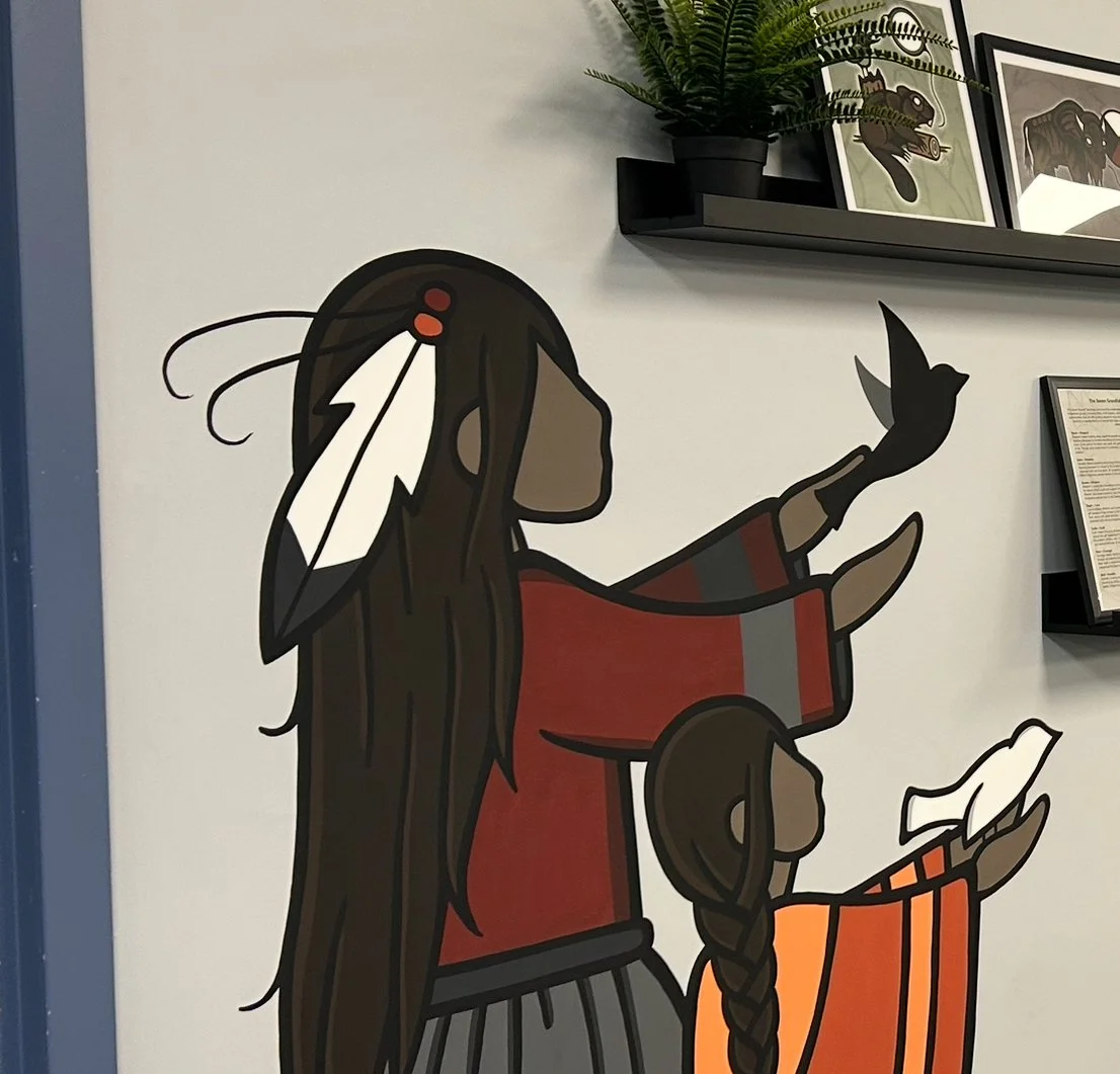 I have created close to 50 murals and installations across Winnipeg, in hospitals, community centres, youth centres, elementary and high schools, daycares, as well as large public art projects. Each piece is created in the Woodland art style, a style that carries stories of connection between spirit, animals, nature, and people.